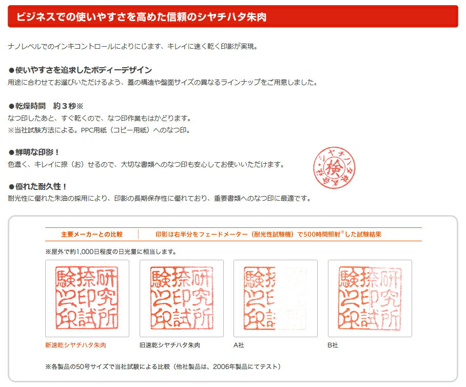 ビジネスでの使いやすさを高めた信頼のシャチハタ朱肉 ●乾燥時間 約3秒※ なつ印したあと、すぐ乾くので、なつ印作業もはかどります。