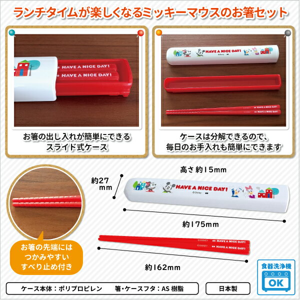 商品名 ミッキー スタンダード(Disney) お箸&ケース サイズ 箸:16.2cm 箸ケース:W17.5xD2.7×H1.5cm 素材 箸・ケースフタ:AS樹脂 (耐熱温度:100℃) ケース本体:ポリプロピレン (耐熱温度:140℃) 商品説明 Disneyのランチシリーズにかわいい『ミッキースタンダード』が登場しました☆